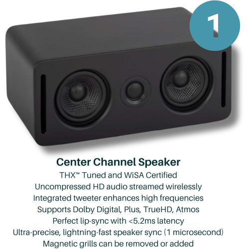 - Configuración sencilla: conecta los altavoces y el transmisor WiSA SoundSend (incluido) a tomas de corriente y conecta SoundSend a tu Smart TV. SoundSend se conecta automáticamente a tus altavoces Mónaco. El diseño compacto facilita la colocación del altavoz, y el subwoofer de perfil bajo cabe debajo de muchos sofás.