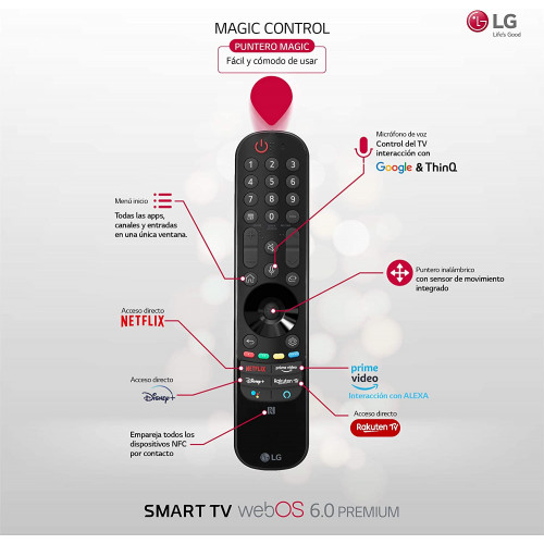 - Conectividad mejorada con 4xHDMI 2.1, 3xUSB 2.0, WiFi (802.11ac), Bluetooth V5.0, LAN RJ45, Magic Remote incluido