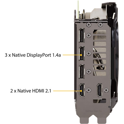 Diseño de 2,7 ranurasEl difusor de calor concentra el calor en unos caloductos que lo transportan a una matriz de aletas que se extiende a lo largo del perfil de 2,7 ranuras. Esta generación de tarjetas gráficas TUF Gaming también cuenta con un disipador para la la VRAM que mantiene a raya la temperatura de la memoria. | Componentes TUFSeleccionamos los componentes de las tarjetas gráficas de TUF Gaming en base a su durabilidad y rendimiento. Los componentes se sueldan a la PCB con nuestro avanzado proceso de fabricación automatizada Auto-Extreme. Los puntos de soldadura suaves en la parte posterior y la eliminación de errores humanos asegura que todas nuestras tarjetas gráficas cumplan con las rigurosas especificaciones de ROG. Por último, las gráficas se someten a una validación compuesta por 144 horas de exigentes pruebas. | Mejoras en la parte traseraLa parte trasera de la tarjeta revela una serie de mejoras. La placa protectora de metal cuenta con un orificio deventilación que permite que el aire caliente escape hacia los extractores del chasis, en lugar de reciclarse con el aire frío. Debajo de la GPU, un soporte refuerza la conexión crítica entre la GPU y el difusor. El soporte de conexiones de acero inoxidable protege los puertos al tiempo que proporciona un proceso de montaje más seguro. Y el interruptor Dual Bios permite seleccionar los modos rendimiento y silencio sin tener que recurrir al software. |