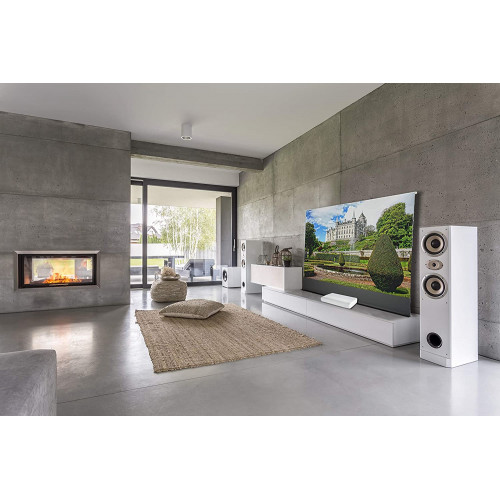 La pantalla de contraste motorizada de suelo CLR HomeCinema UST de celexon, en combinación con un moderno proyector de distancia ultracorta, es un verdadero sustituto de la televisión de pantalla grande. Gracias a la innovadora tela de la pantalla de proyección de contraste de 8K de celexon (conocida como pantalla CLR HomeCinema UST de celexon) y a la inteligente construcción con articulación de tijera eléctrica, es posible obtener fácilmente una imagen grande en casi cualquier habitación. La gracia aquí proviene de que cuando no se está utilizando, la superficie de la pantalla desaparece casi por completo de la vista ya que la pantalla no tiene que ser montada en la pared o el techo, sino que desaparece dentro o detrás de un tablero bajo. Esto crea el sueño de un televisor enrollable de 100-120", que sólo es visible cuando está en uso.