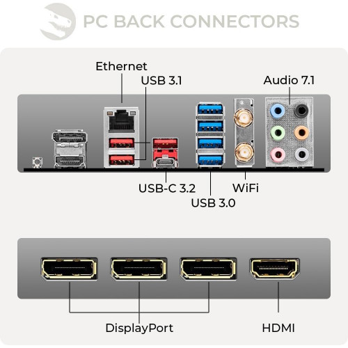 - : 21,5 x 45 x 43,4[DIMENSIONES (AN X AL X PR, CM)]: 1x USB.C 3.2 | 3x USB 3.1 | 4x USB 3.0 | 3x Display Port | 1x HDMI | 2.5 Gigabit Ethernet LAN | Audio 7.1